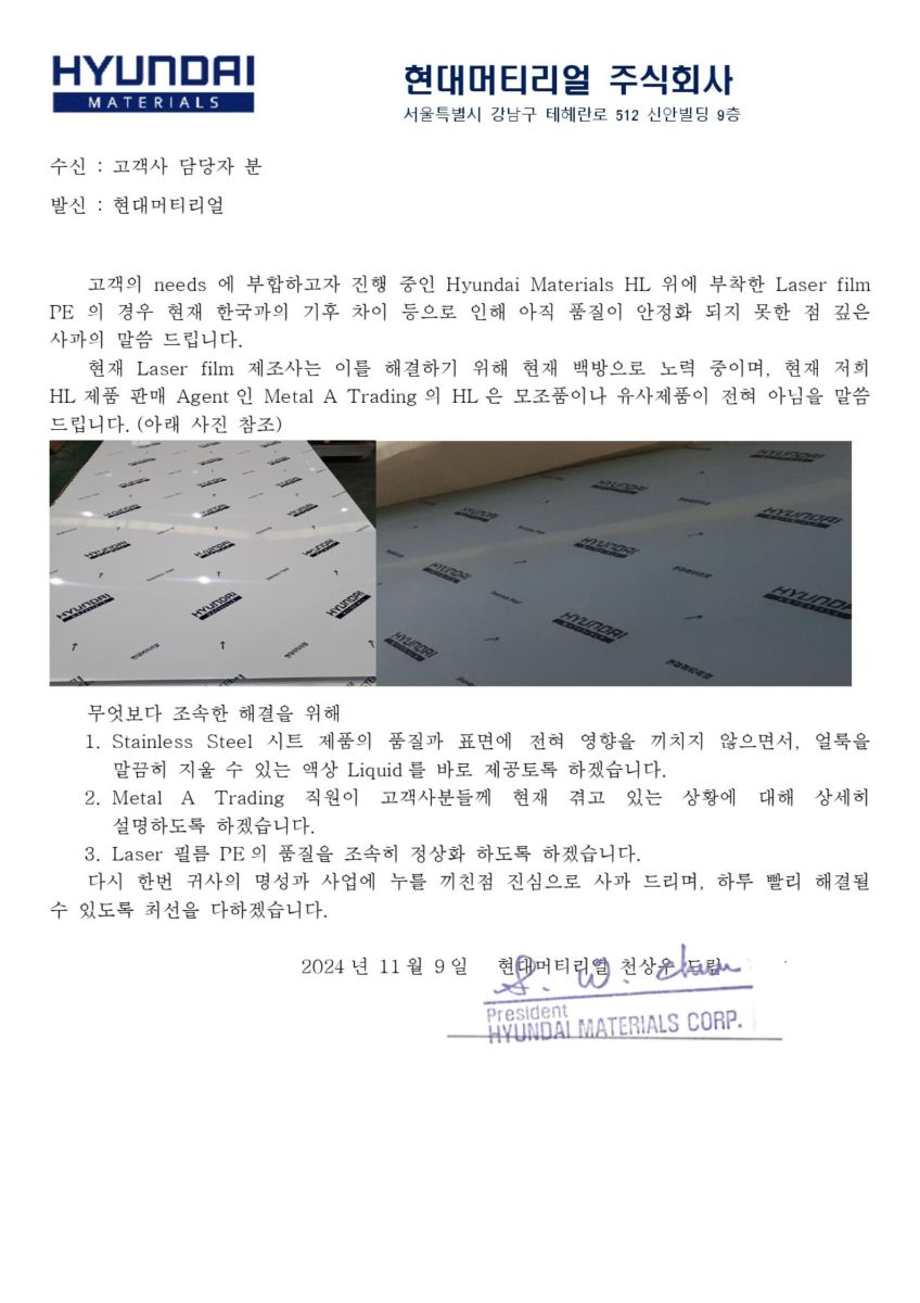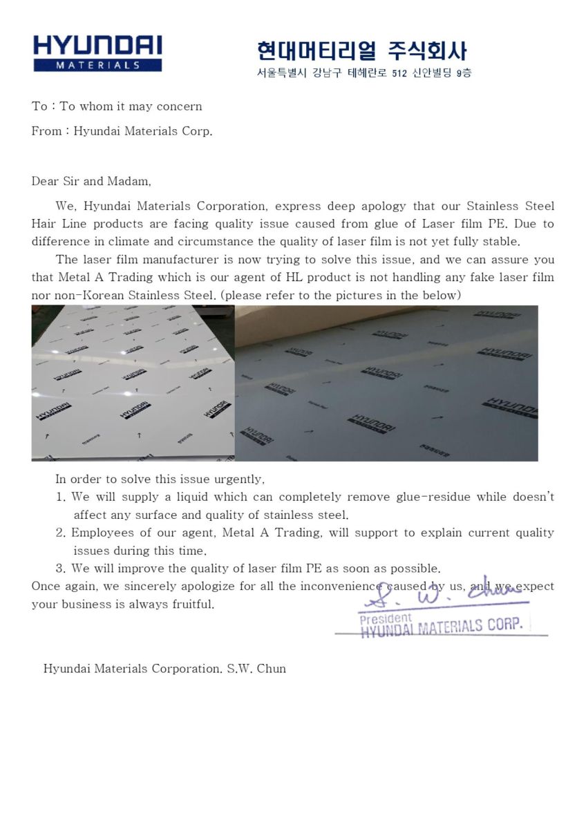 Chúng tôi, Công ty Hyundai Materials kính gửi tới Quý khách hàng lời xin lỗi sâu sắc bởi vi hàng thép không gỉ HL ( xước sọc nhuyễn) của chúng tôi đang đối mặt với vấn đề về chất lượng do bị ảnh hưởng bởi lớp keo Lazer PE ( keo dùng trong máy cắt lazer). Bởi vì sự khác biệt về khí hậu, thời tiết, nhiệt độ dẫn đến lớp keo bám dính của PE là chưa hoàn toàn ổn định, sau khi lột PE đã để lại lớp keo bám dính nhẹ lên bề mặt của sản phẩm.